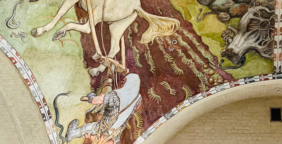 When you come in, have a look at the ceiling of the entrance hall where you will see four Kalevala-themed frescoes by Akseli Gallen-Kallela: Ilmarinen plowing the viper field, Forging Sampo, Sampo's defence and the Great Pike. Based on the Finnish national epic, they were originally painted for Finland's pavilion at the World Exhibition in Paris in 1900.