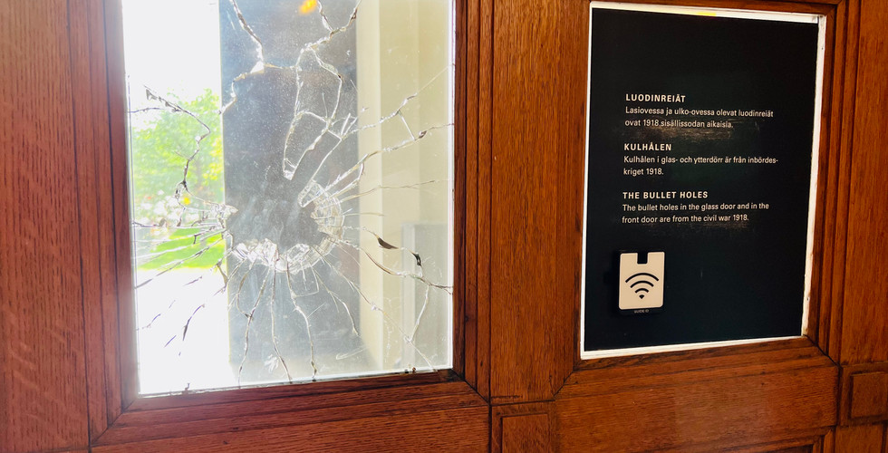 Check also the glass of the inner doors at the entrance and you will see where a stray shot from the Reds came in on 13 April 1918. In the Finnish civil war, the reds fired white and German troops from the barracks close by when the Germans occupied Helsinki.